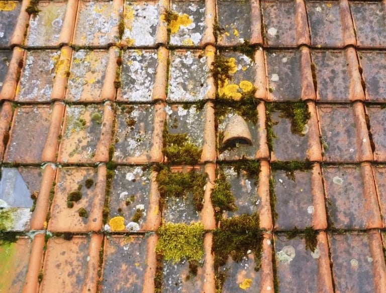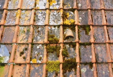 Des tuiles qui deviennent poreuses, blanchâtres ou friables, les gouttières obstruées par des débris de toiture.