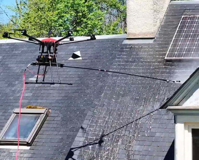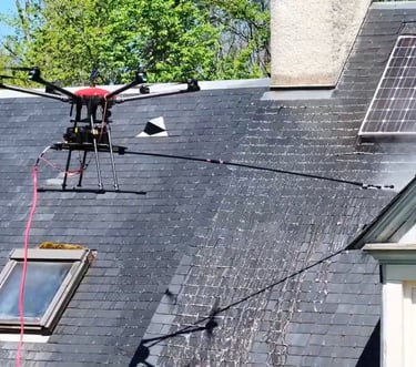 Grace au drone EOTIC SPRAY L, l'intervention est réalisée en quelques heures seulement, allant jusqu'à 60 mètres de haut et 180 Bar de pulvérisation à haute pression. Aucun risque de casse.